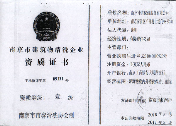 南京保潔公司注冊資金10萬元,是江蘇省家庭服務協會會員單位,江蘇省家政服務業(yè)分類執(zhí)行標準起草制定單位,先后被評為江蘇誠信服務先進單位、南京是家政服務定點培訓單位、南京市十佳建筑物清洗企業(yè)、南京市誠信示范單位、南京市鼓樓區三信三優(yōu)單位。董事長康朋是江蘇省家庭服務業(yè)協會副會長、江蘇省家政服務分類執(zhí)行標準主要起草人。